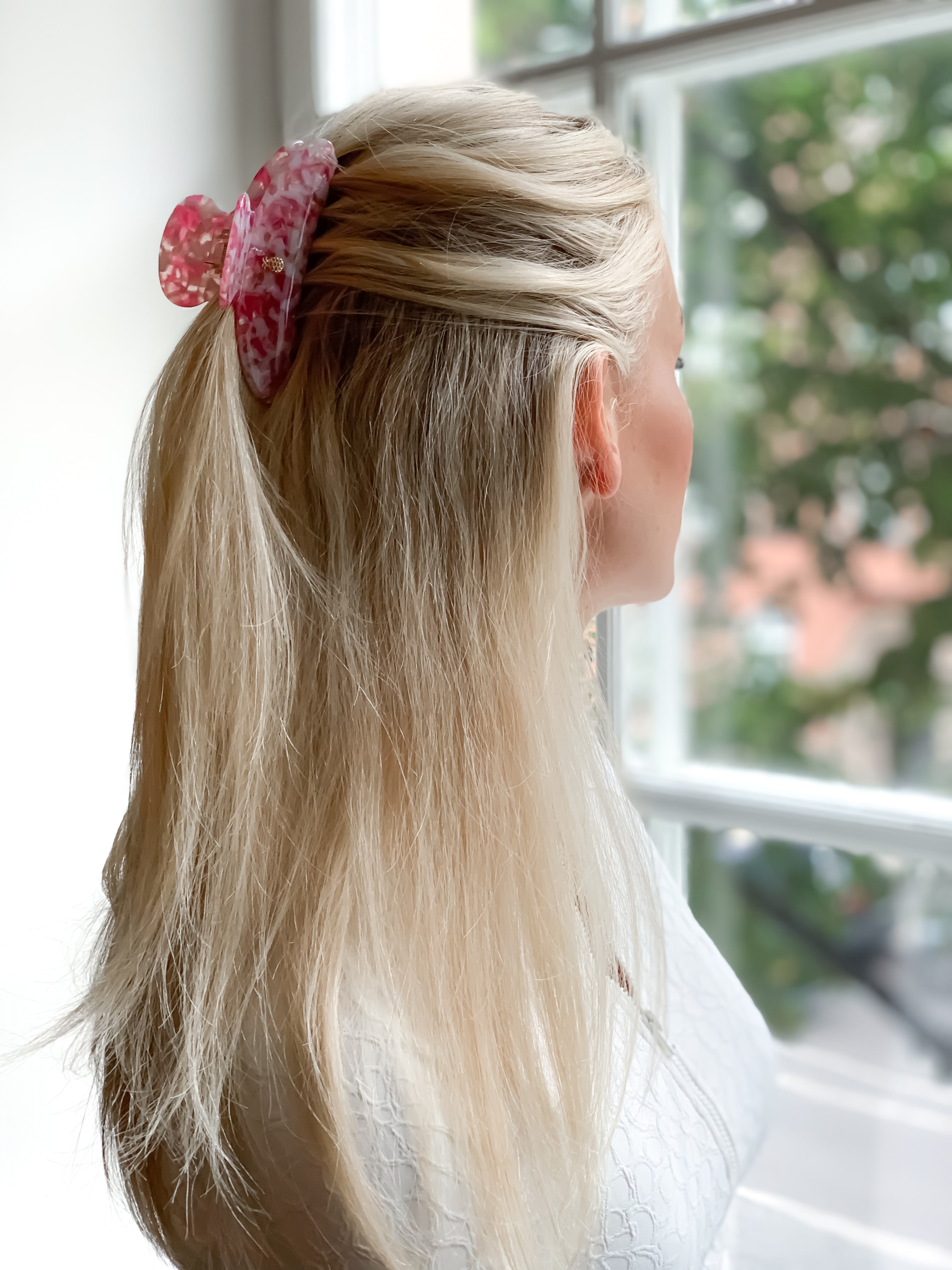 We simply adore this large hair claw in a pink & white acetate, with a golden IA BON pineapple logo in center.