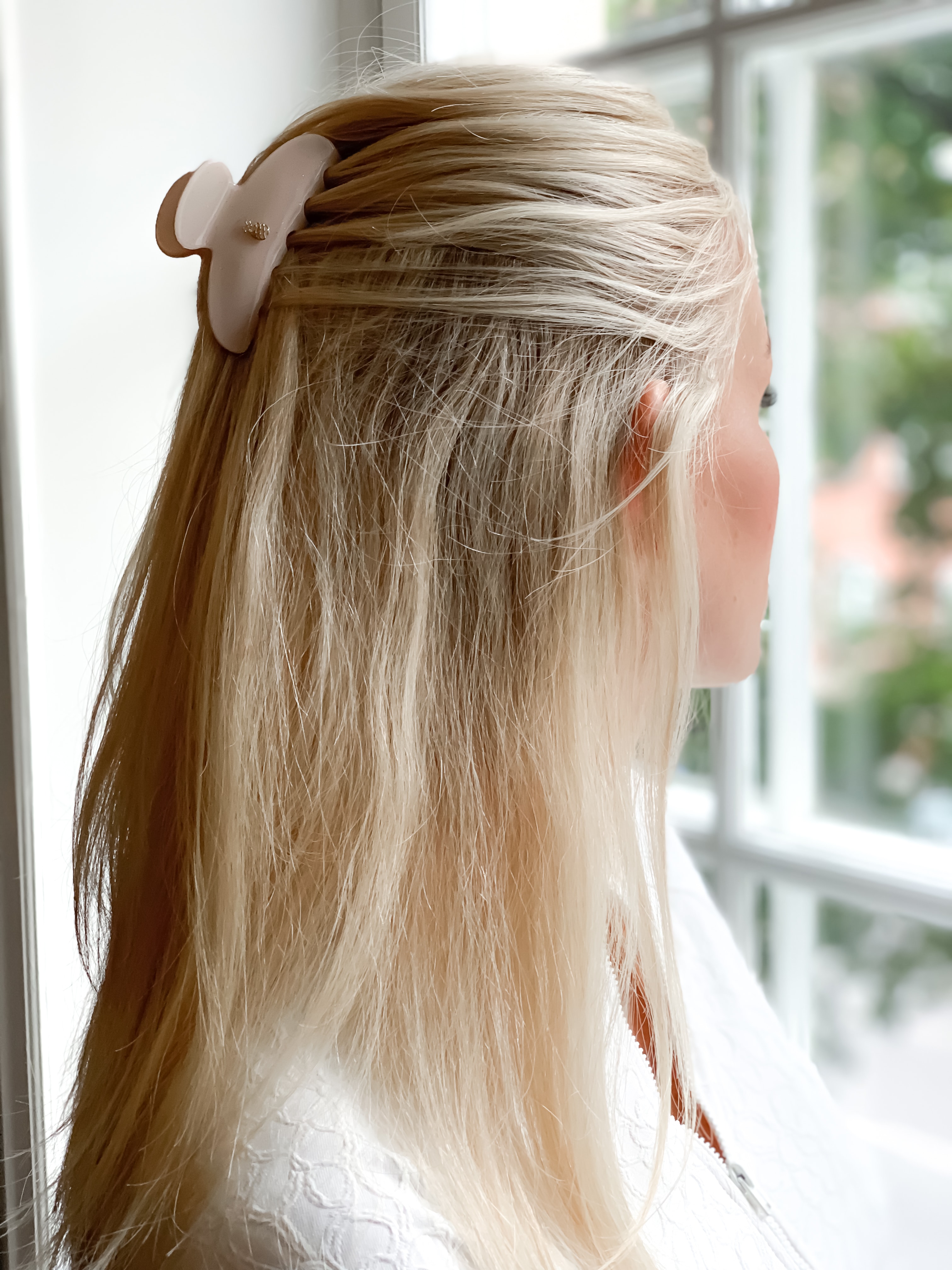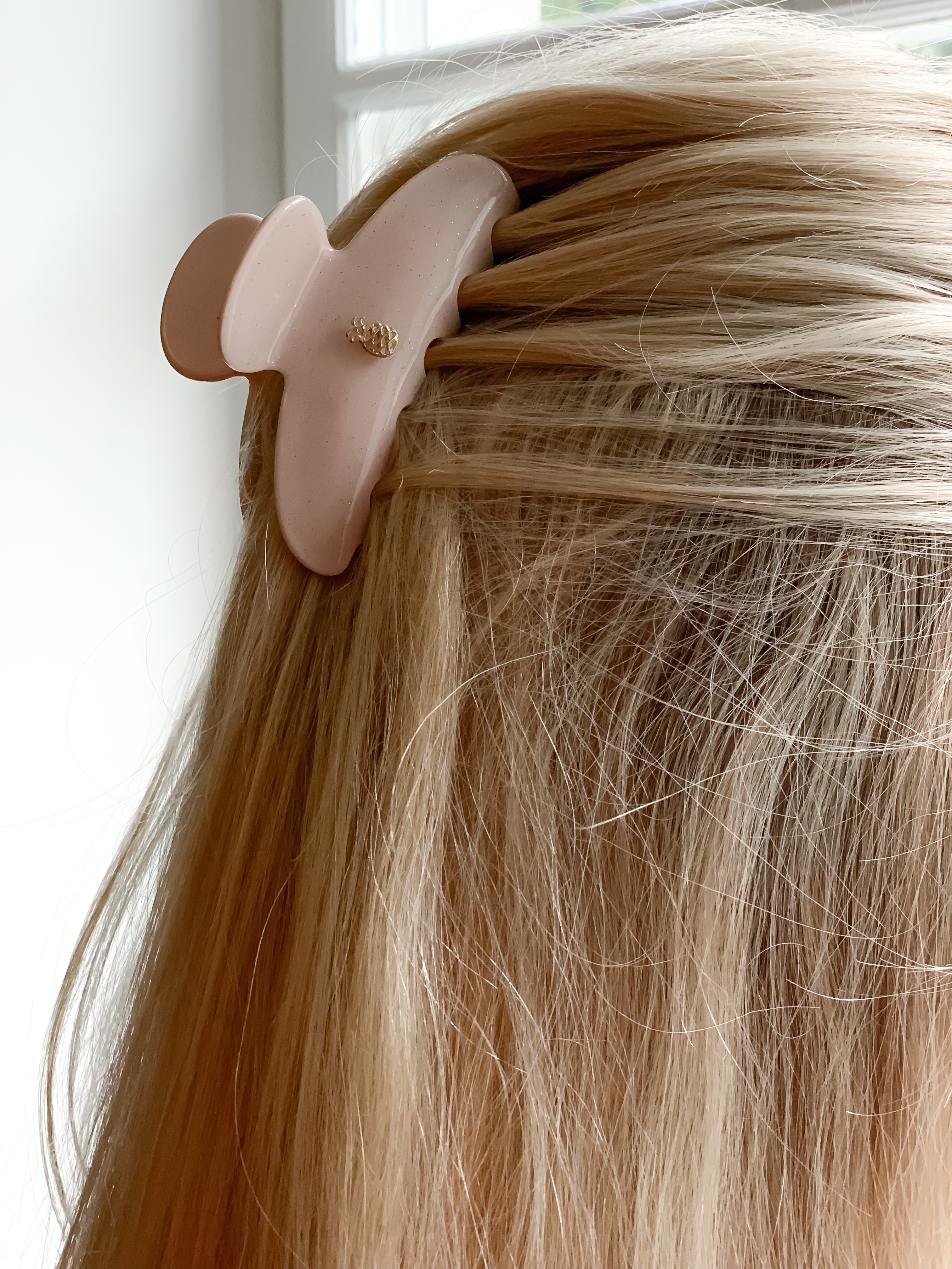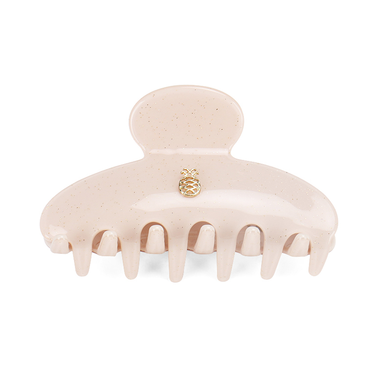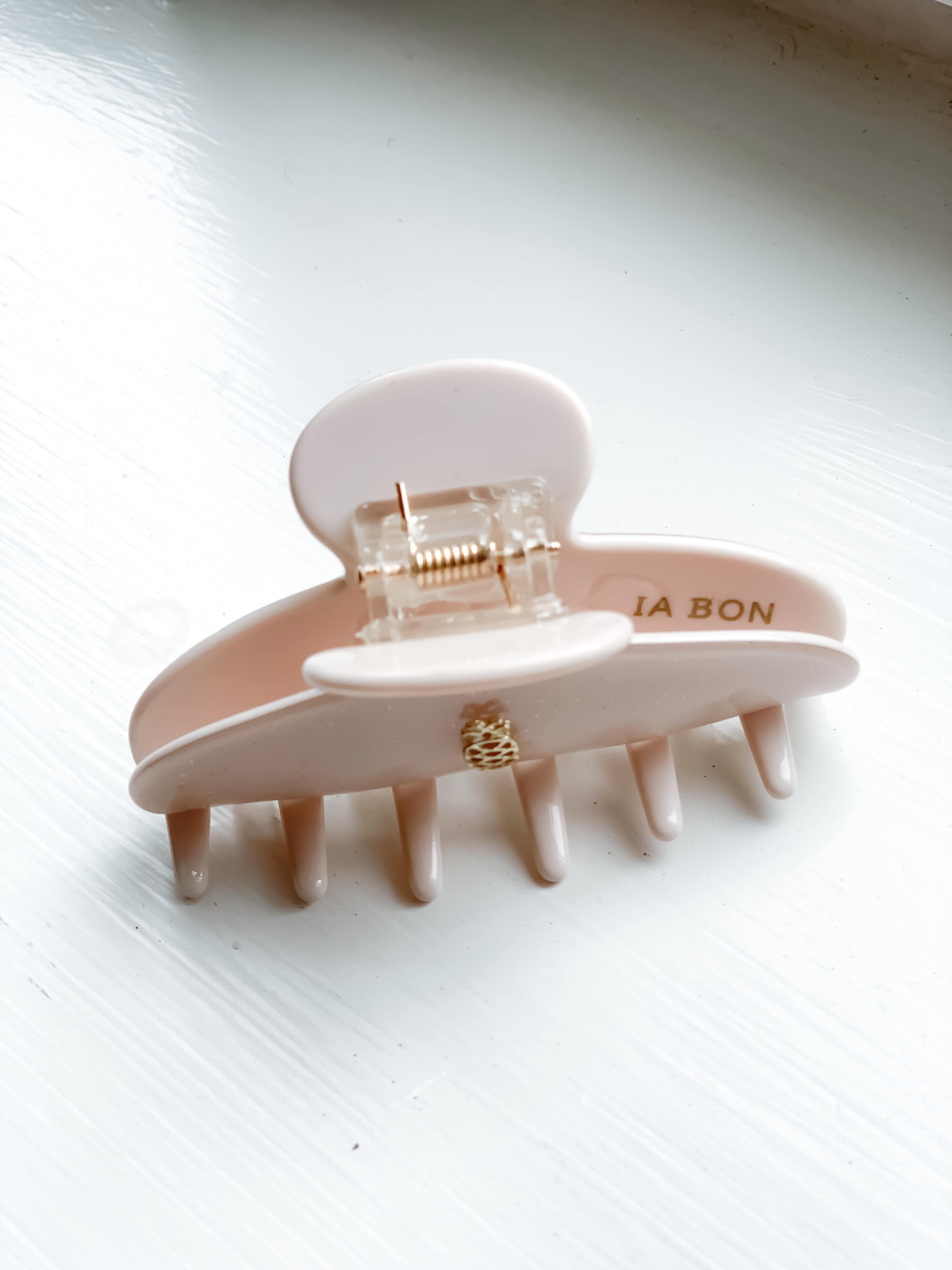 We simply adore this hair claw in nude pink, with a hint of glitter, with a golden IA BON pineapple logo in center.