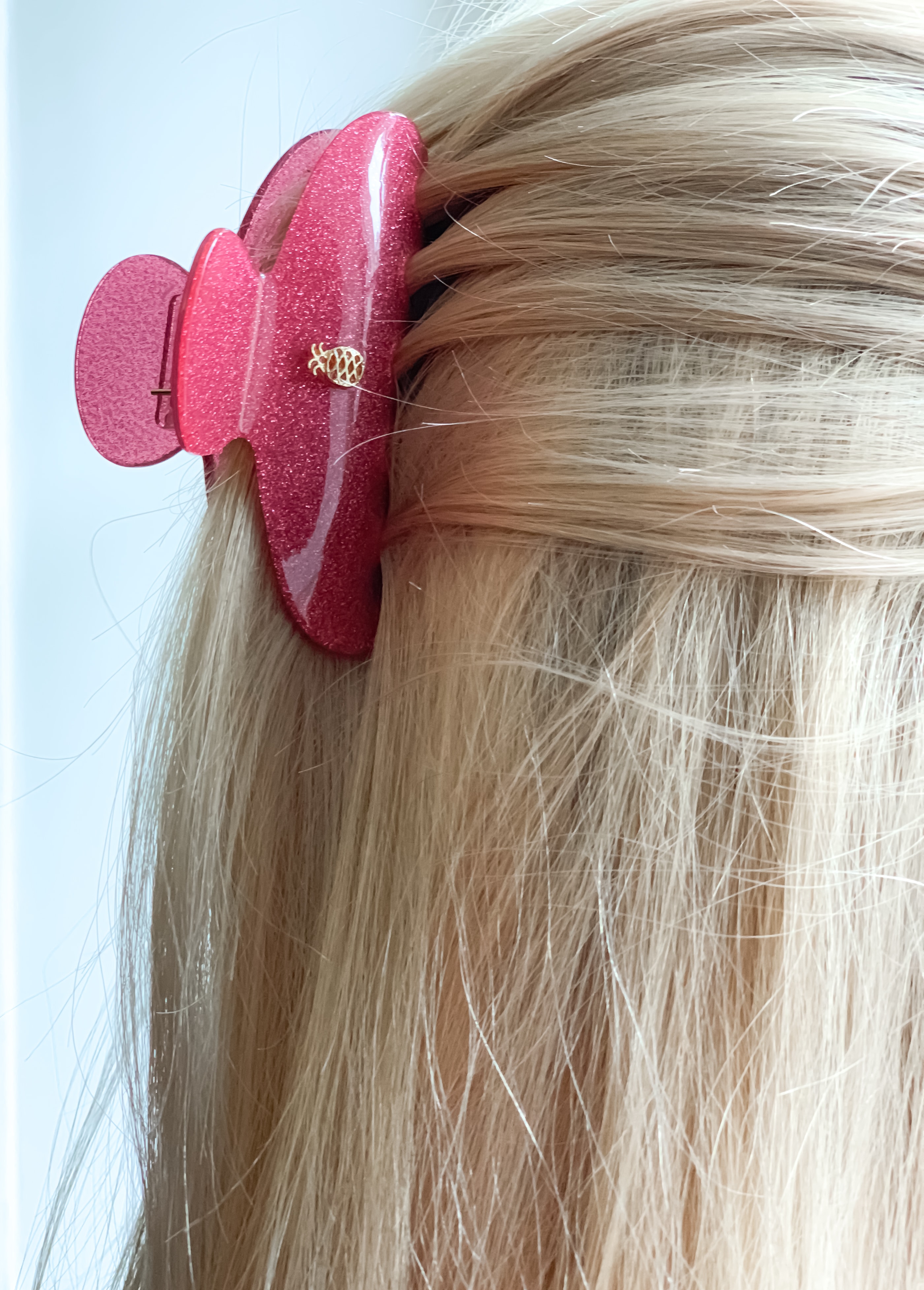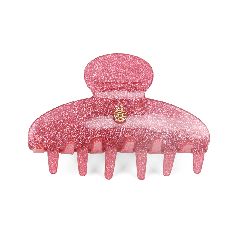 We simply adore this hair claw in pink glitter acetate, with a golden IA BON pineapple logo in center.