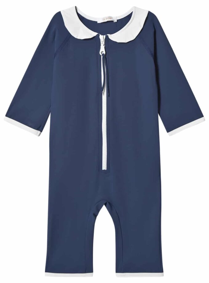 A two-piece suit with a high collar, and 3/4 length legs & sleeves. A full lenght zipper on the front with a pinch-free zipper flap to protect children’s skin. The full length zipper makes the suit easy to take on and off, especially when it is wet. Practical drawstring on pants to adjust waist. A beautiful golden “IA BON”-pineapple logo on the upper back.