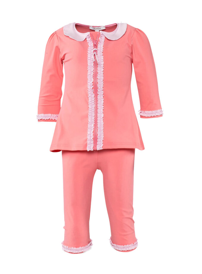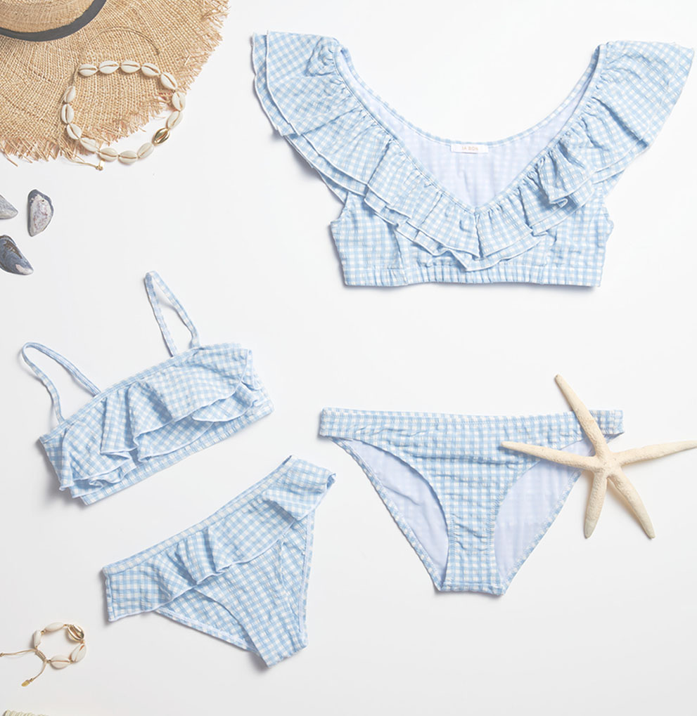 This girls bikini has two large ruffles that makes it cute, plus it has great coverage.