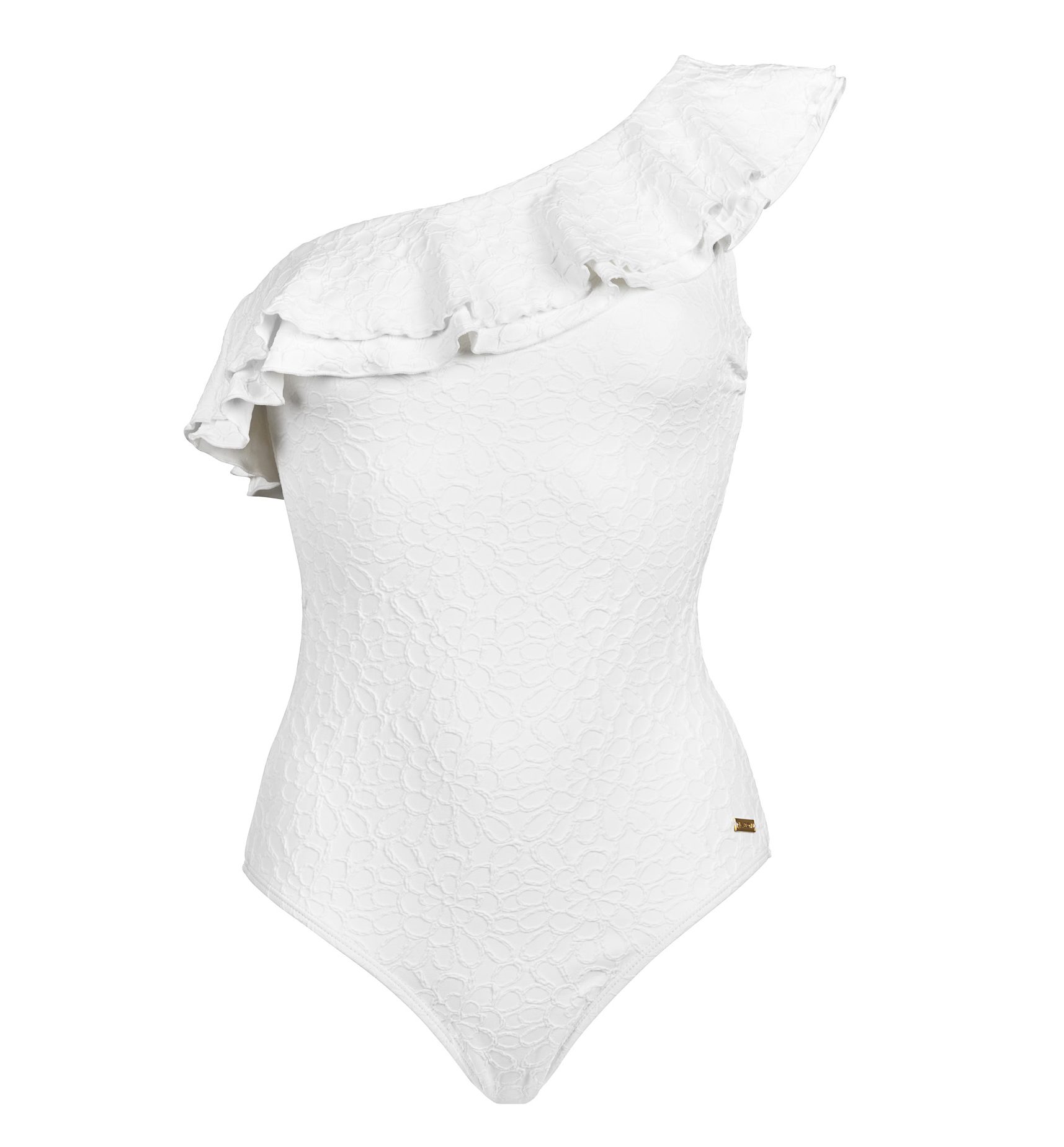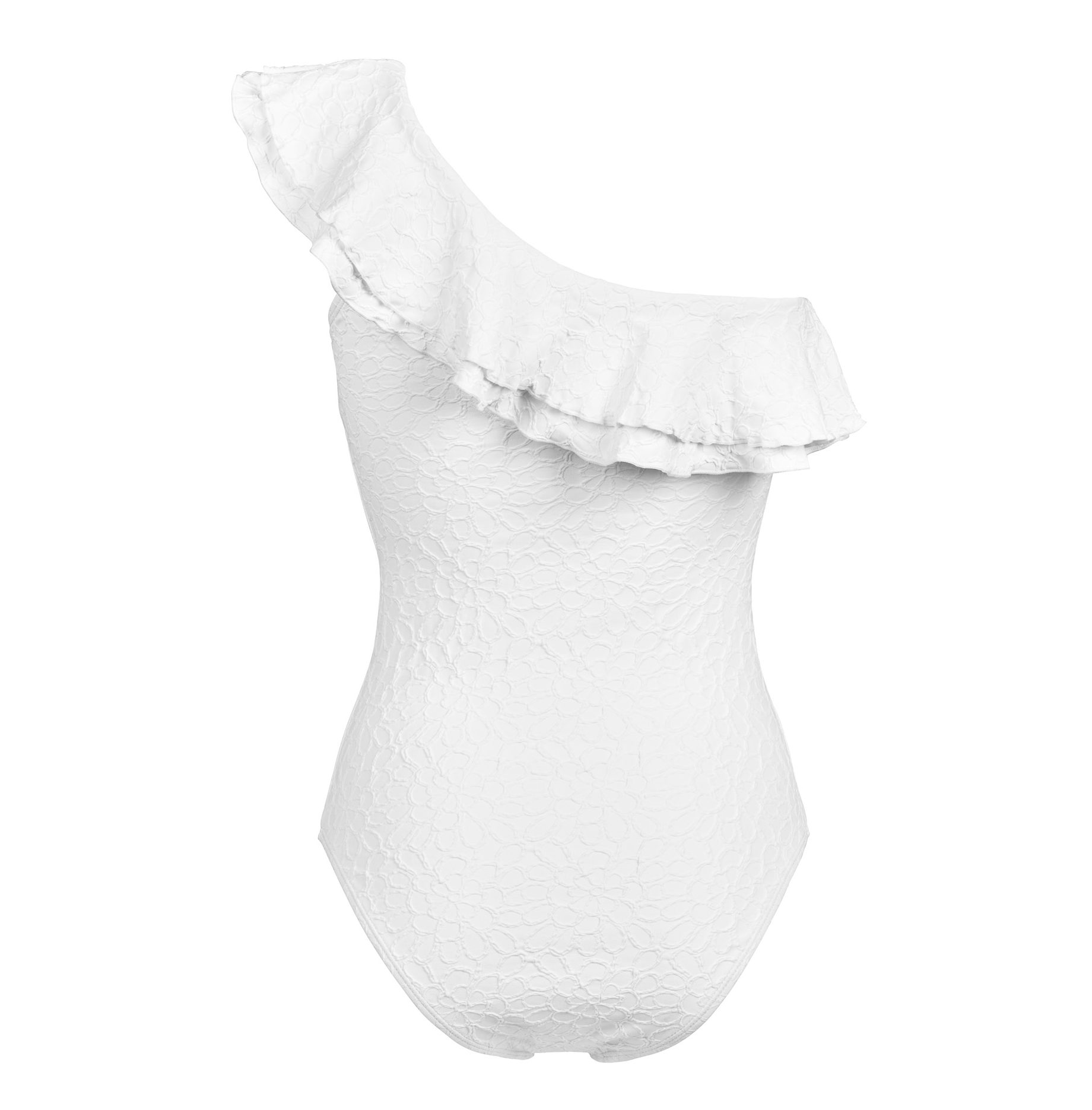 This swimsuit has a ruffled one-shoulder neckline which is flattering and makes a statement on the beach or poolside.