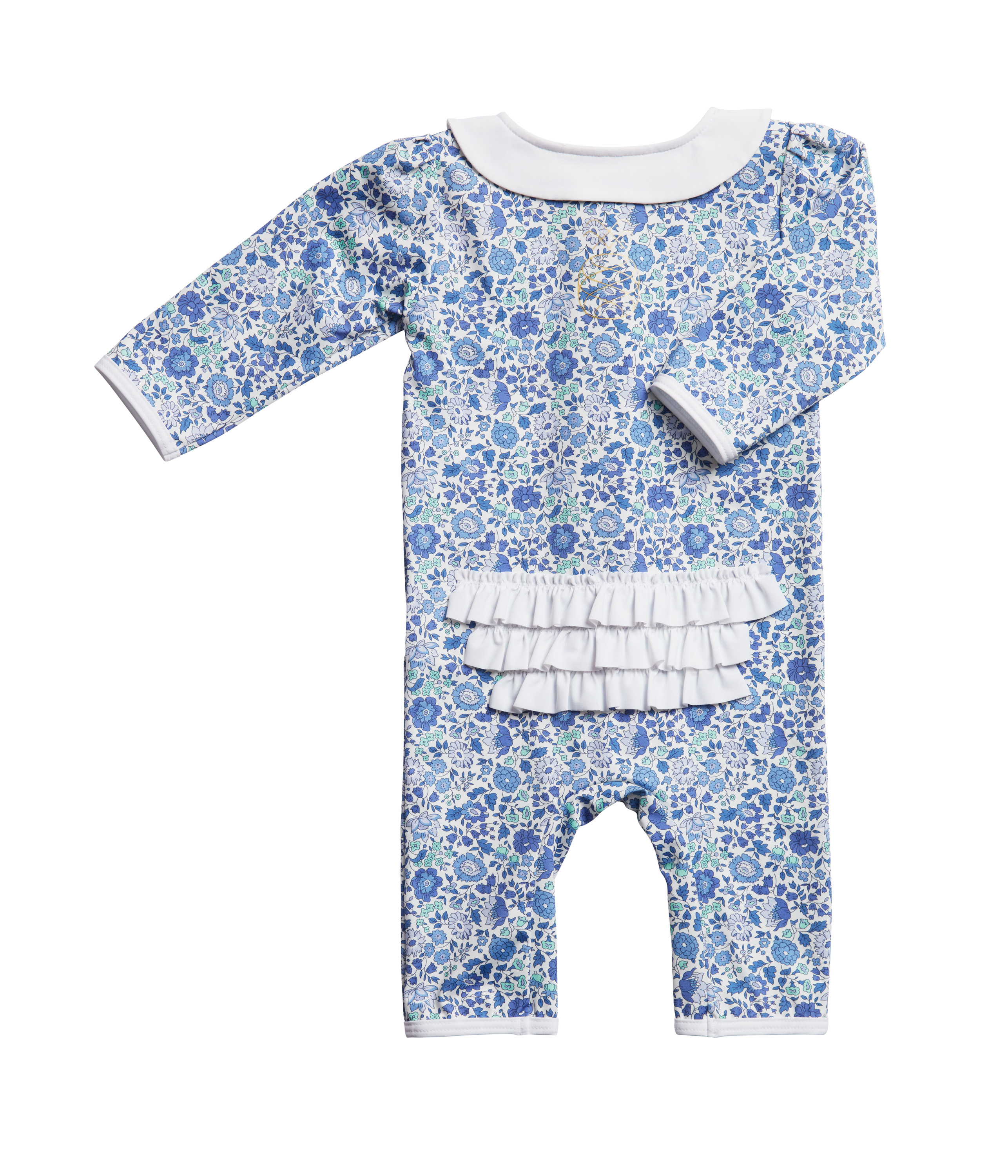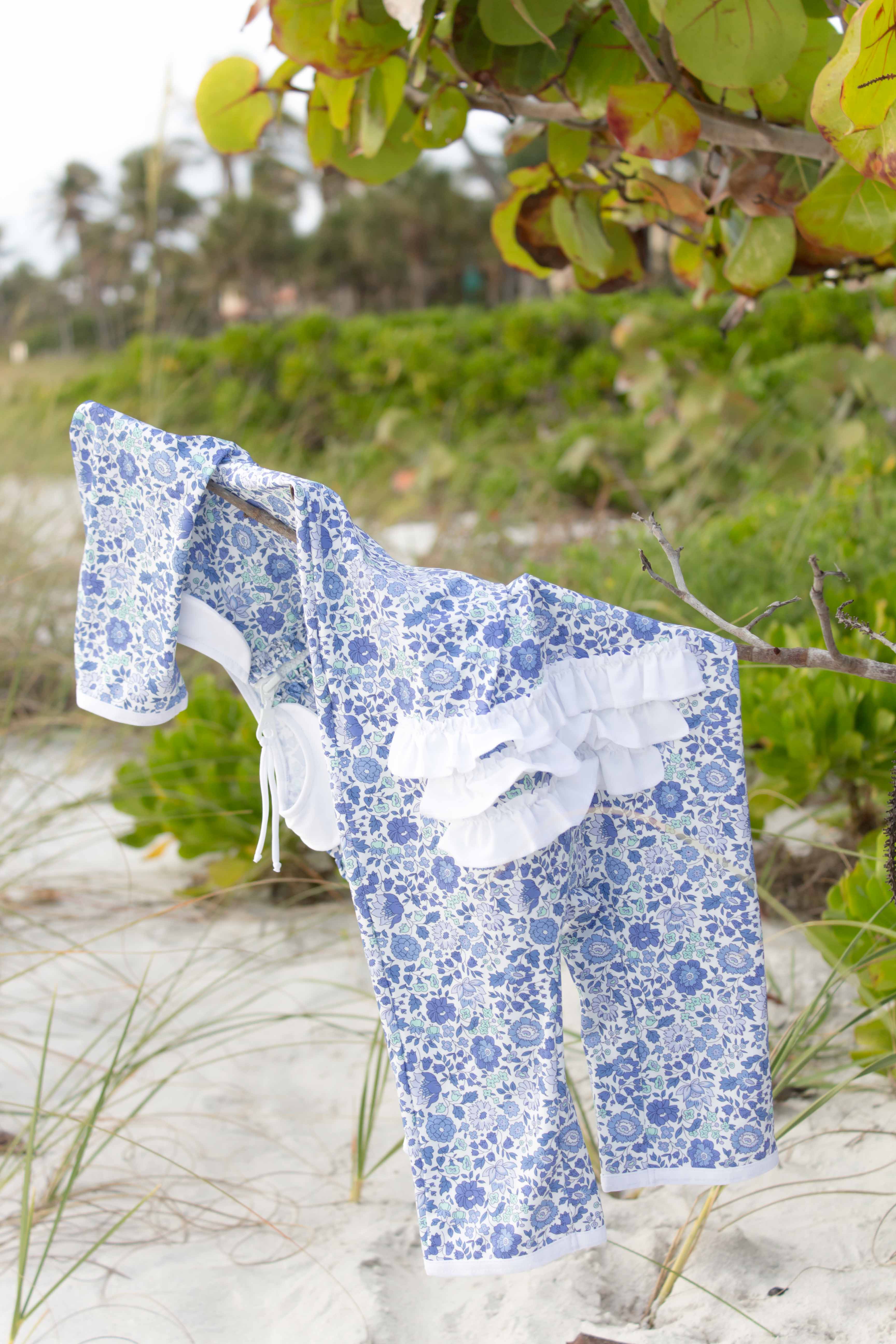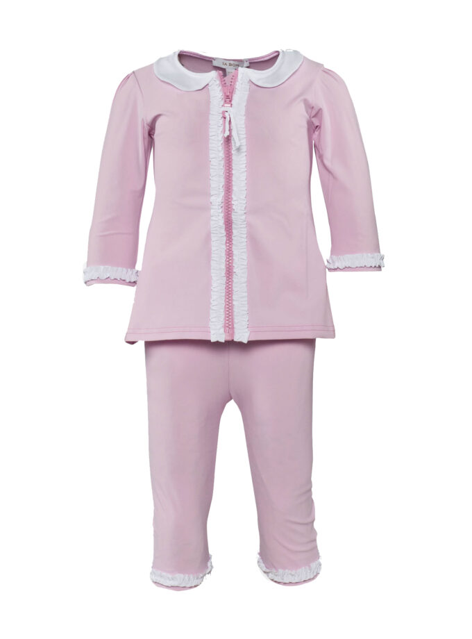 A one-piece suit with a cute peter pan-collar, and 3/4 length legs & sleeves. A zipper on the front, with a pinch-free zipper flap to protect children’s skin. The zipper makes the suit easy to take on and off, especially when it’s wet. White ruffles along the zipper and on the tush. A beautiful golden “IA BON”-pineapple logo on the upper back.