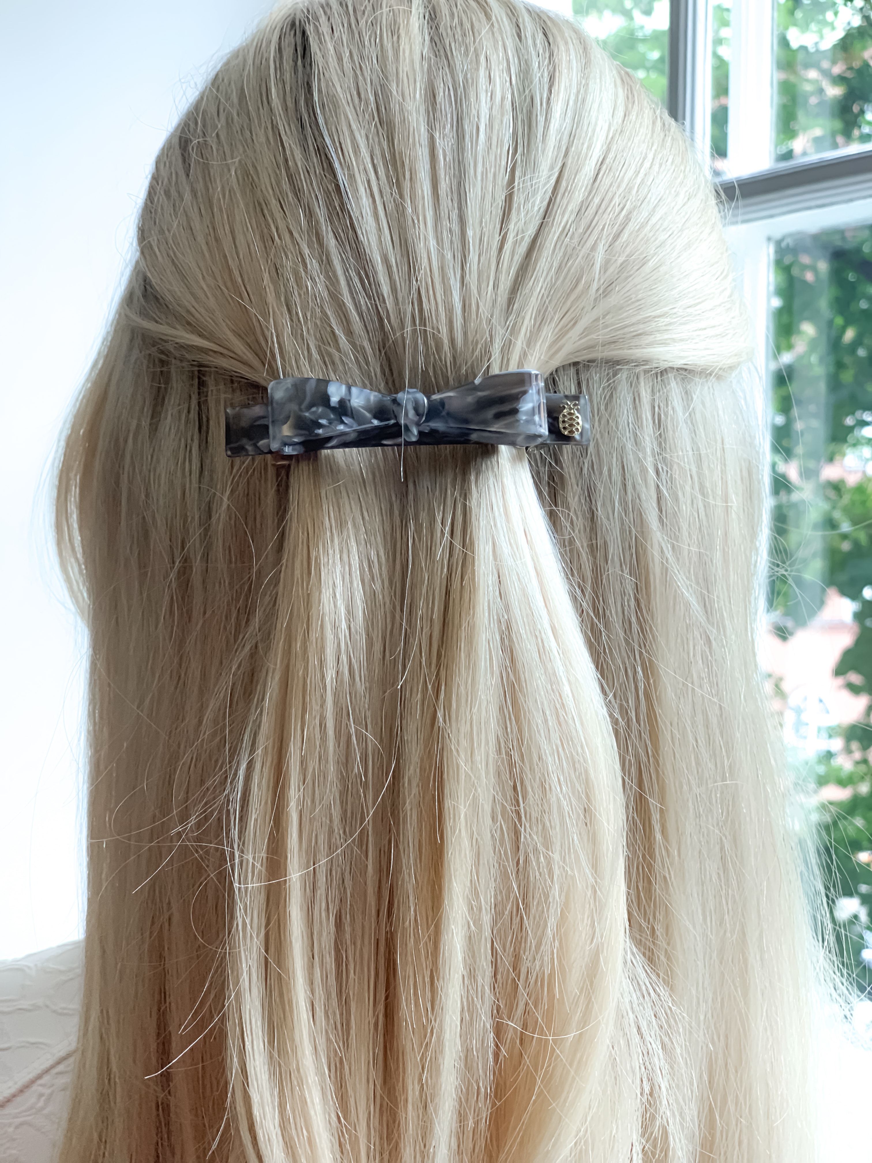 Expect many compliments when you wear this super cute bow clip in grey marbled acetate, with a golden IA BON pineapple logo on the right edge.